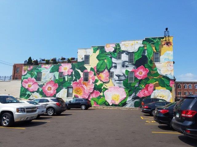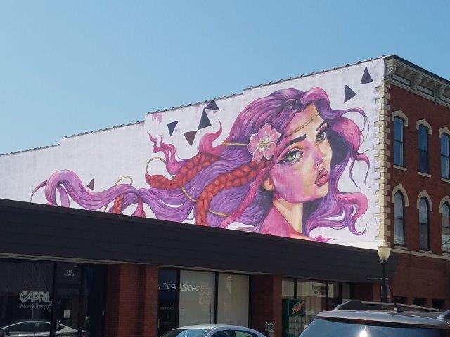 - “‘Wild Rose’ was inspired by Iowa’s national flower. I wanted the colors to compliment the cityscape with the reds, purples, and pinks. ‘Wild Rose’ is a beautiful confident woman who is not afraid to stand out. As she turns around, her vibrant hair flips as she looks at the viewer in the eyes. The same beauty that was offered to me during my stay in Dubuque, I wanted to leave behind something just as beautiful! This is my largest and most ambitious mural to date.” -Didi